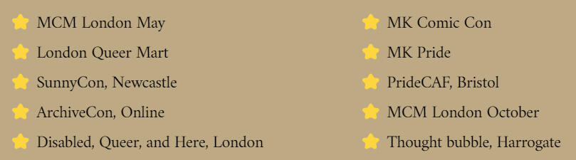 Hello! My name is Mi, I am a queer, disabled artist based near Oxford, UK. I have been exhibiting at artist alleys and art markets since 2018. Since then I have exhibited my wares at a variety of events up and down the UK, both comic cons and indie markets alike. In 2024, I attended:
