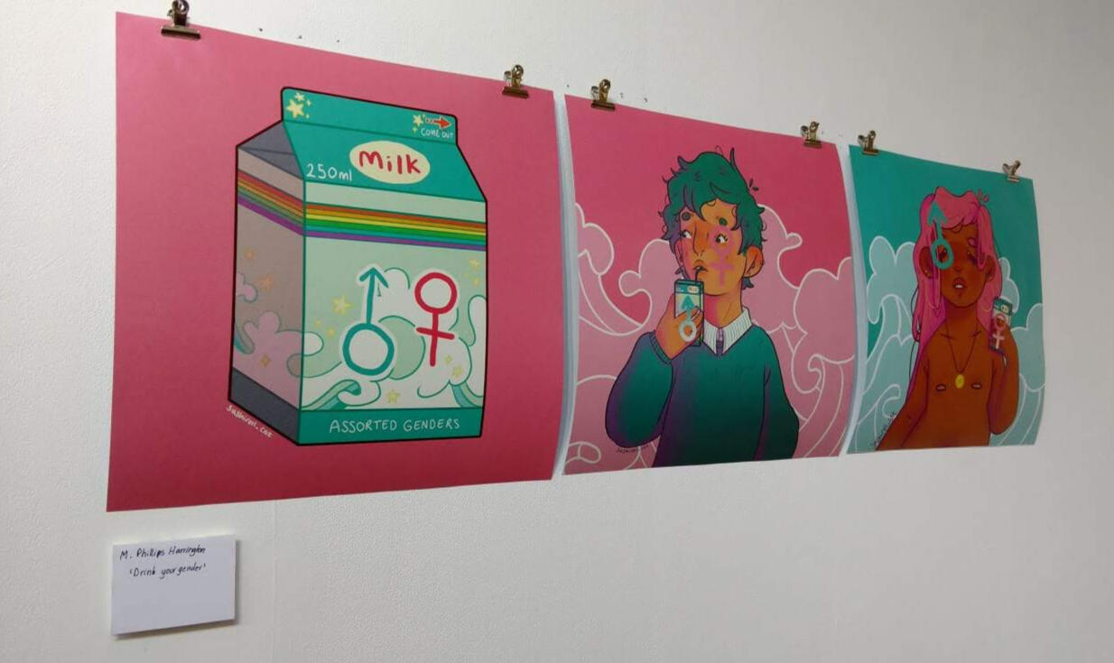 In August 2018, my series of work 'Drink Your Gender' showcased in the pop up exhibition 'People Power On Paper' that was held at Cave Space, Pimlico.The event featured young artists and art that discussed modern social progress. I decided to focus on the topic of gender queer identities and questioned the issue of how society views those who identify outside of their assigned sex.