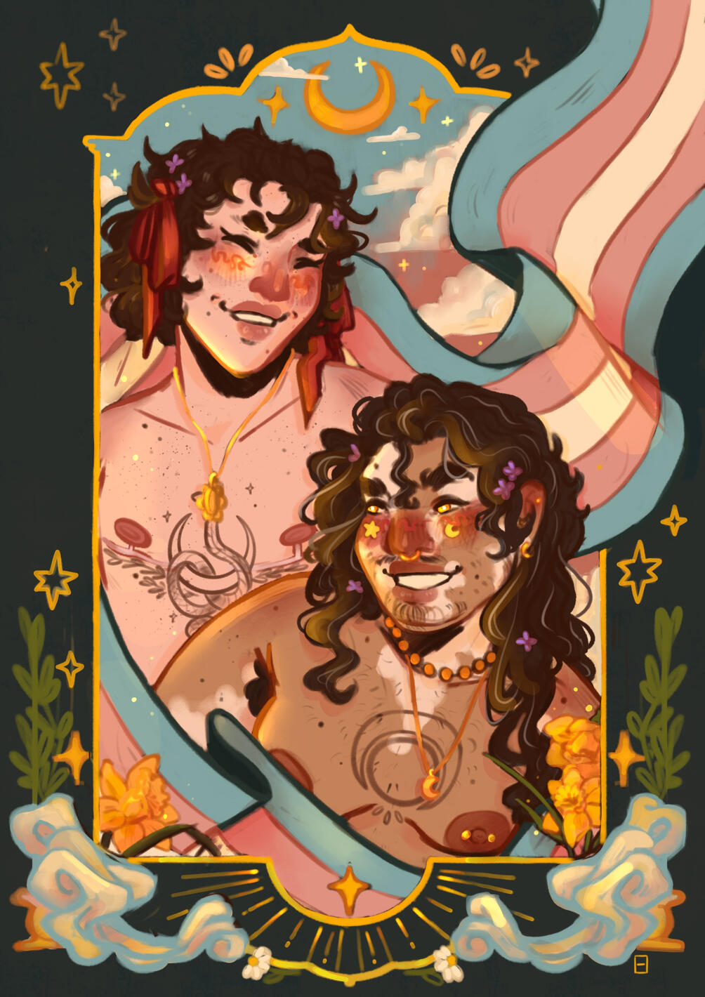 My present work is created in a digital medium and predominantly focuses around themes of queer identities paired with magic, eldritch entities and mysticism. My art is heavily inspired by the art nouveau and pre-Raphaelite movements, as well as the symbolic meanings involved in the popular Victorian movement of floriography. I capture characters of my own original designs who exist with fantasy settings inspired by faith, academia, self-exploration and above all else, the queer experience.Being an individual who experiences gender in a more abstract sense than most common folk, I find myself reflecting my own self-expressions and experimentations in my art. I explore various gender expressions through my work, such as trans individuals transcending the societal normalities of gender.